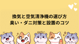 臭い・粉じん・ダニ対策は「換気×空気清浄」の両輪。HEPA+活性炭、部屋の1.5倍目安、ケージ直風NGを押さえ、季節別の運用と掃除をルーティン化しましょう。