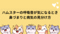 - 呼吸が早い/肩や脇腹が大きく動く、口を開けて呼吸(重症サイン) 対応:香り源を即撤去→別室で安静→室温20–26℃/湿度40–60%に整える 症状が続く・重い場合は小動物に詳しい病院へ(使用した製品名を伝える)