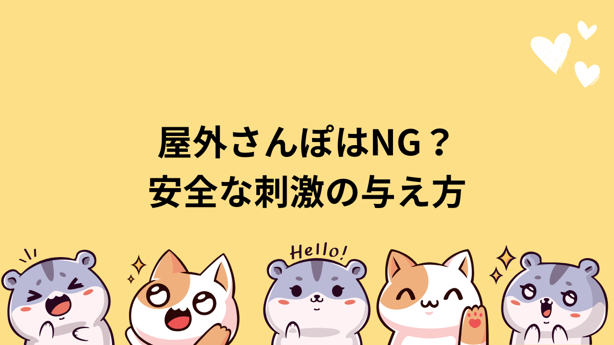 屋外さんぽは、気候変動・病原体・捕食者・脱走などリスクが高く、ハムスターには不向きでなのでハムちゃんの為にやめてあげましょう!代わりに室内で“匂い・掘る・隠れる・探す・走る”を満たす環境を用意しましょう!短時間のへやんぽは安全対策を徹底し、無理せず即中止の判断を!