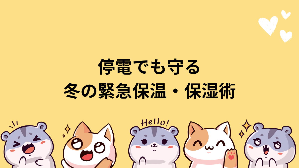 冬の停電は「断熱で逃がさず、外付け保温で暖め、湿度を40〜60%に保つ」が鉄則です 即席湯たんぽと外付けカイロで数時間をしのぎ、復旧後は段階的に通常環境へ 結露後の交換と体調ログでトラブルを最小限にしましょう!!